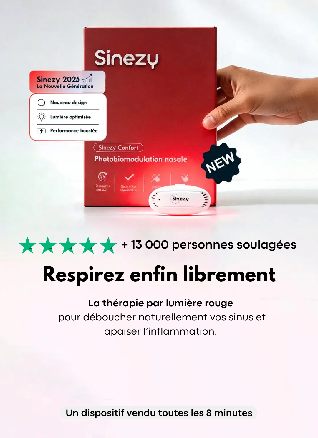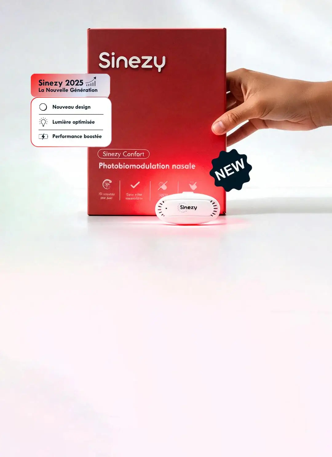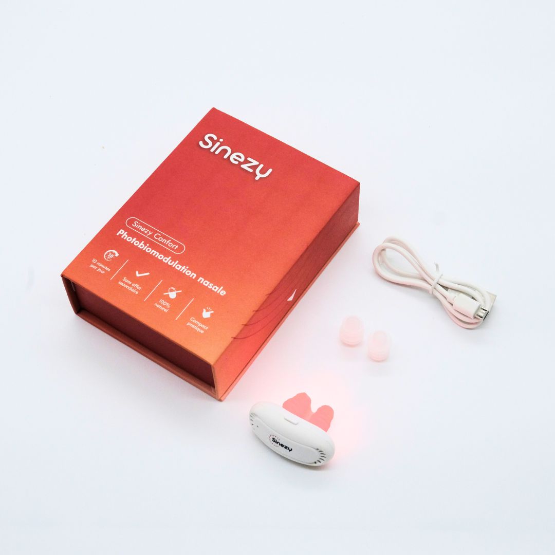 Après cinq années de recherches, de tests et de développement, nous avons conçu Sinezy Confort : un dispositif simple, précis et accessible, qui intègre cette technologie de manière optimale pour agir directement sur les muqueuses nasales.